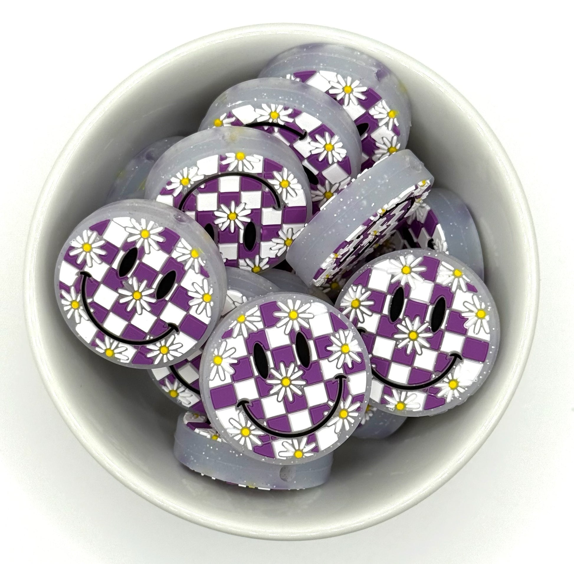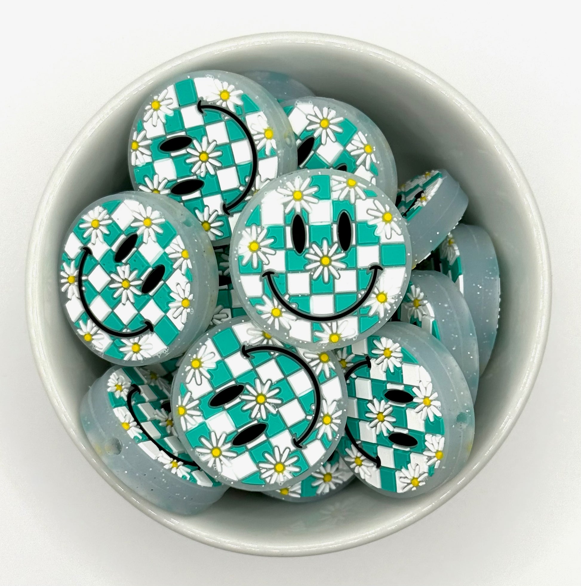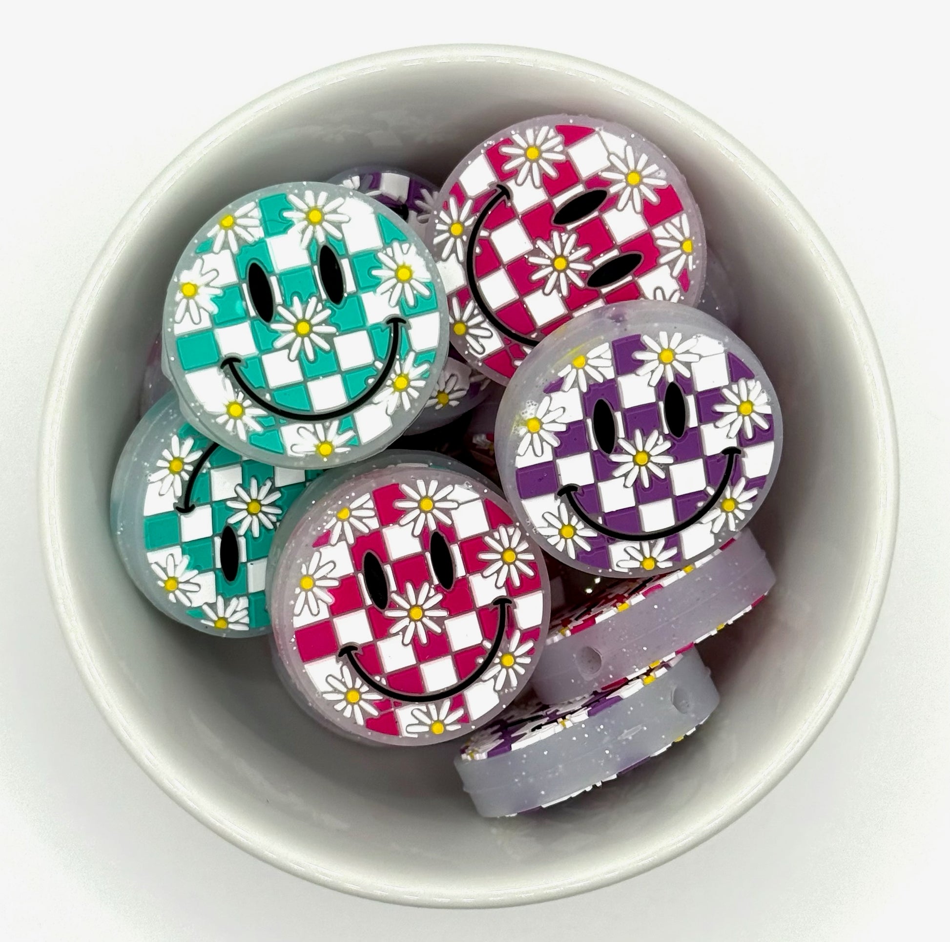 Brighten up your project with these cheerful daisy smilie faces. Featuring a fun checkerboard pattern in vibrant colours. BPA free 100% food grade silicone