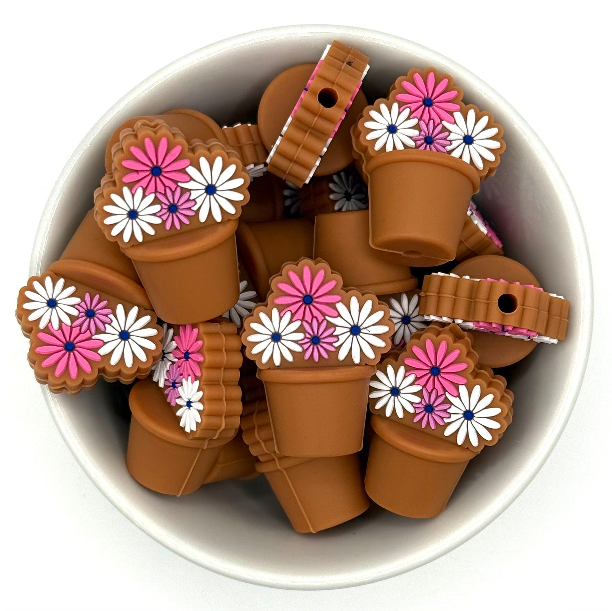 These adorable flower pot focal beads feature a sweet terracotta-style planter overflowing with cheerful pink and white daisies. With layered petal details and a warm earthy base, they bring instant spring vibes to any design, no watering required.
