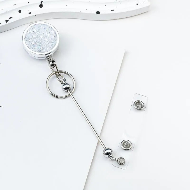 Bring sparkle and personality to your everyday wear with this glitter beadable badge reel. Designed with a shimmering glitter top and a sleek silver-tone finish, this reel includes a straight beadable rod so you can customize it with your favorite silicone or acrylic beads.